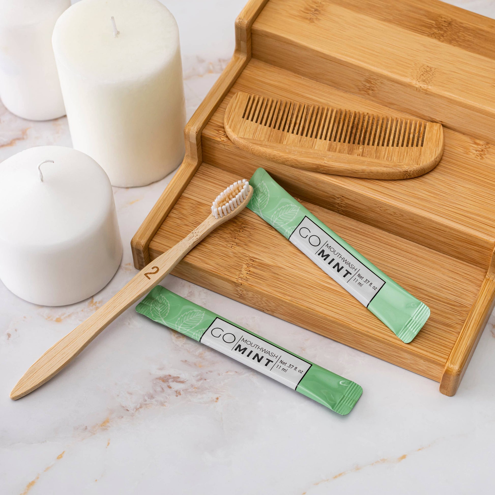 Individually-packaged liquid mouthwash packets offer guests a convenient and refreshing solution to freshen their breath and maintain good oral hygiene. The modern and sleek packaging adds a touch of luxury to any guest bathroom, front desk, or workspace. Providing Go Mouthwash in your accommodations can enhance your guests' stay and make them feel appreciated. It's a thoughtful and practical addition that will leave a lasting impression on your guests.